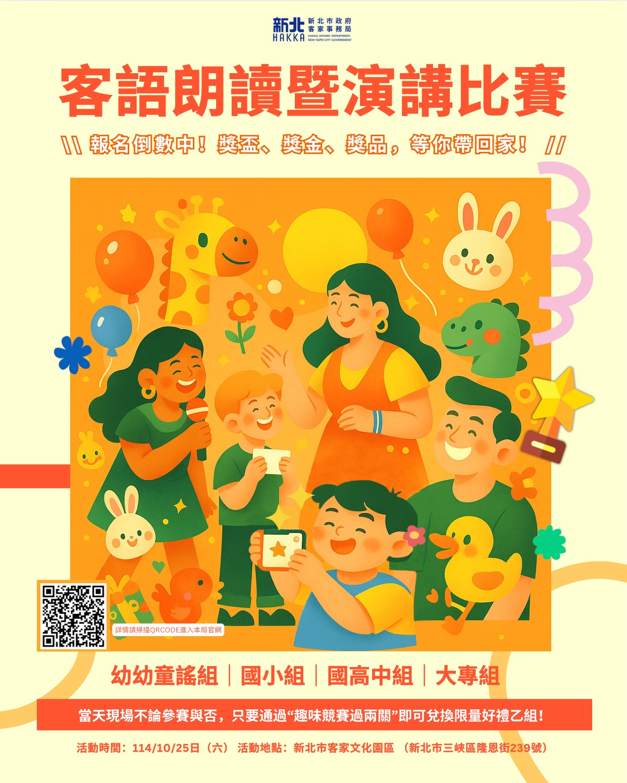 主旨:函轉新北市政府客家事務局「114年客語母語朗讀暨演講 比賽」報名簡章1份,請查照。